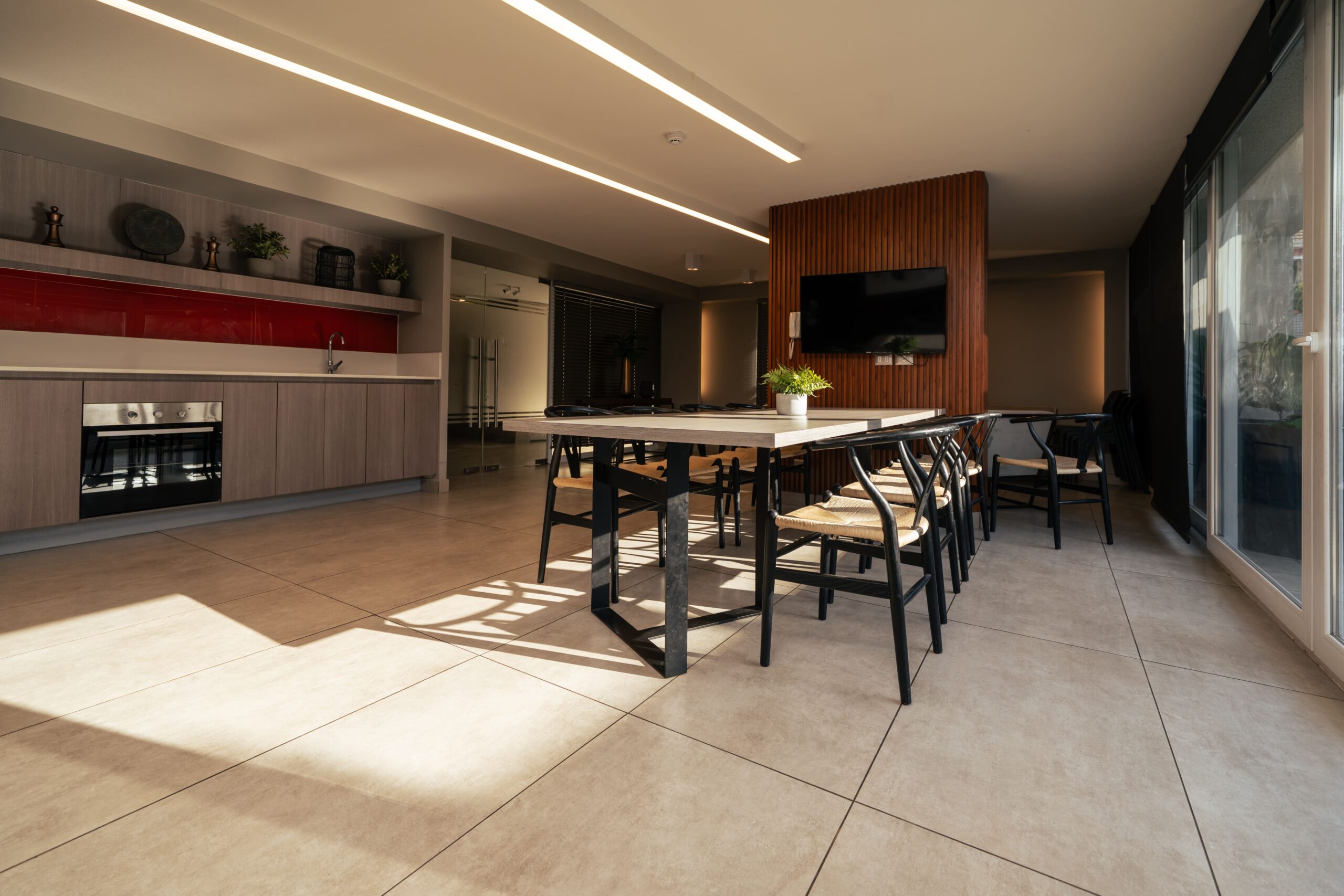 - Cocina equipada con lavaplatos de acero inoxidable, muebles de melamina con cubierta de granito gris, horno eléctrico, encimera vitrocerámica y campana de acero inoxidable.